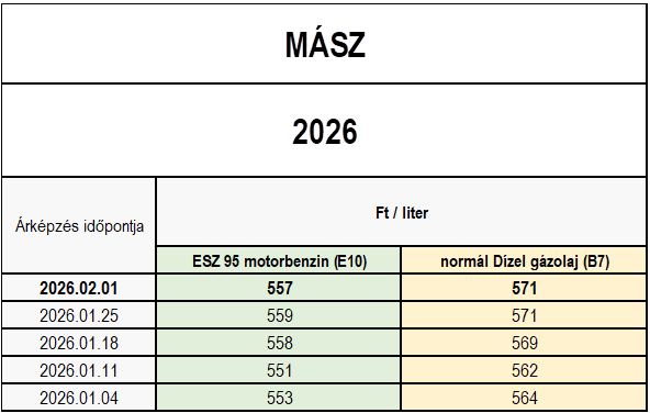• A MÁSZ üzemanyag statisztikai adatszolgáltatásában résztvevő hat tagvállalat bruttó kiskereskedelmi ár tájékoztatása szerint.